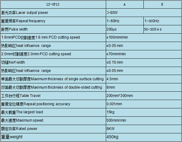 LY-GP12 金剛石精密激光切割機分為A,B兩個機型,此機型為單聚光腔、單棒(YAG晶體)雙燈(脈沖氙燈)雙電源機型,在一個諧振腔內(nèi)震蕩輸出1064nm波長的激光。